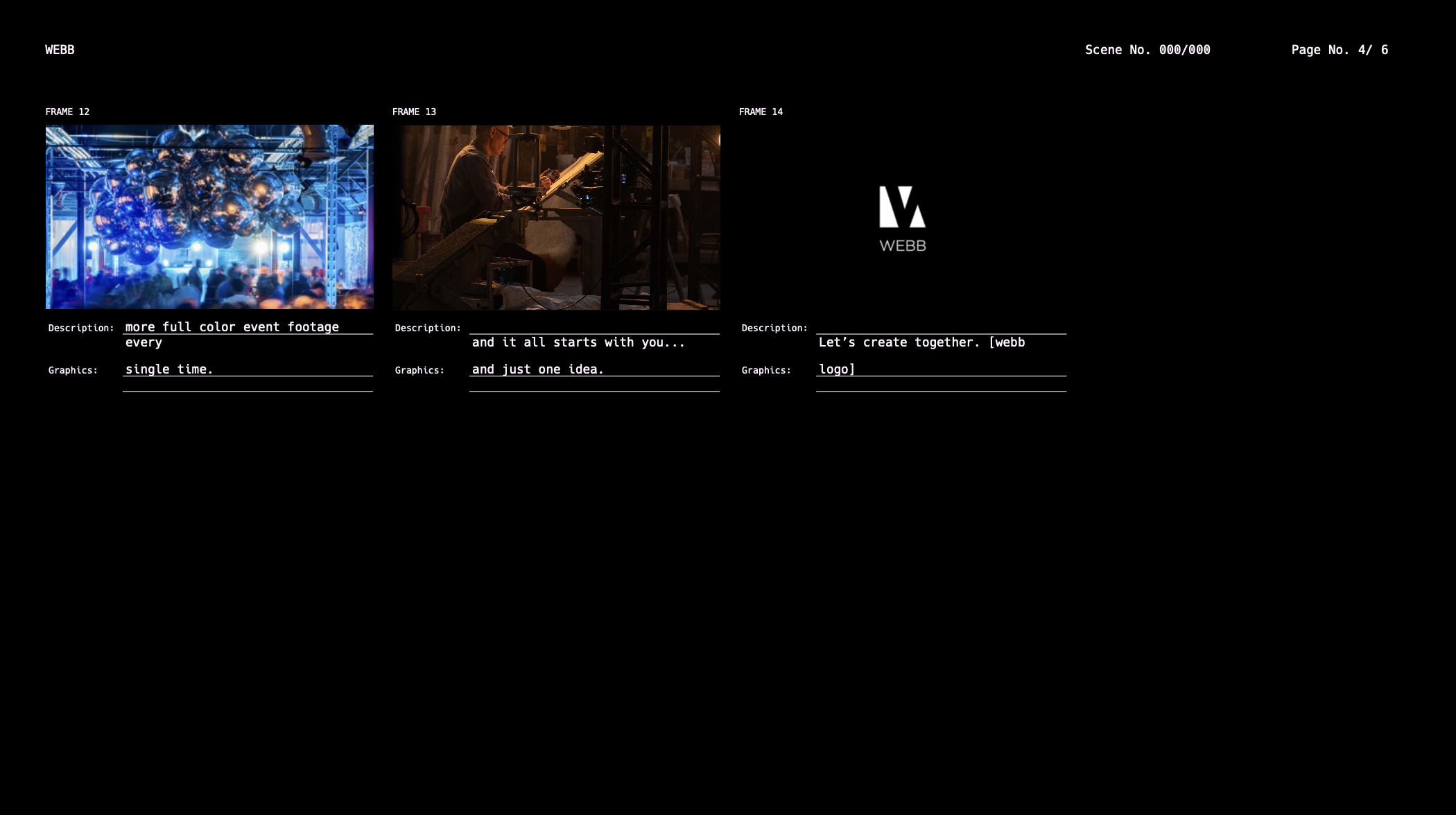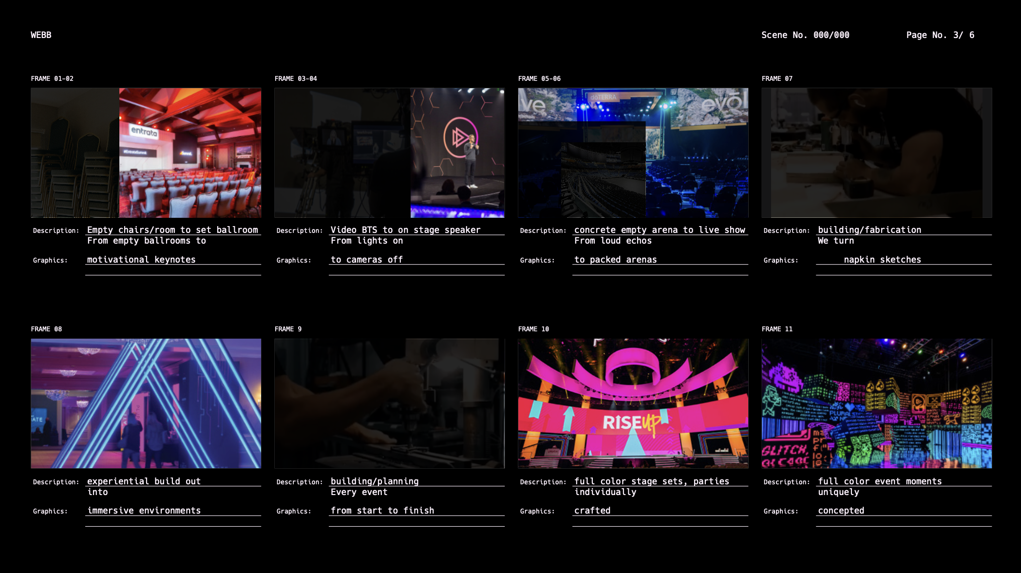 WEBB Production presented to a group of companies hosted by American Express about their event production capabilities. They asked me to put together a script that would communicate what they do in a way that allowed them to show their range of expertise. The thing about events is you are literally creating these impactful environments from nothing. I played off this idea of juxtaposing the nothingness with what it becomes after WEBB gets its hands on it.
